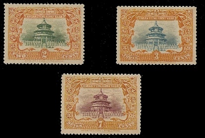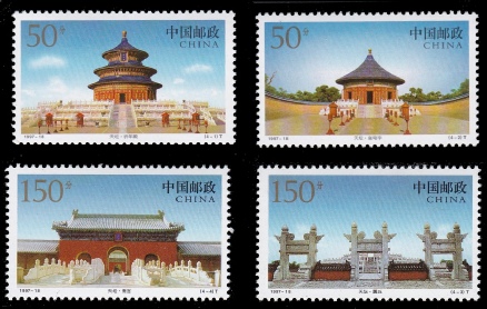 The Temple of Heaven is one of many structures in a large park outside of Peking, China. The pictures above are stamps showing the original structure. The lower right picture shows the second building after the original was burnt to the ground. The upper right set depicts the modern-